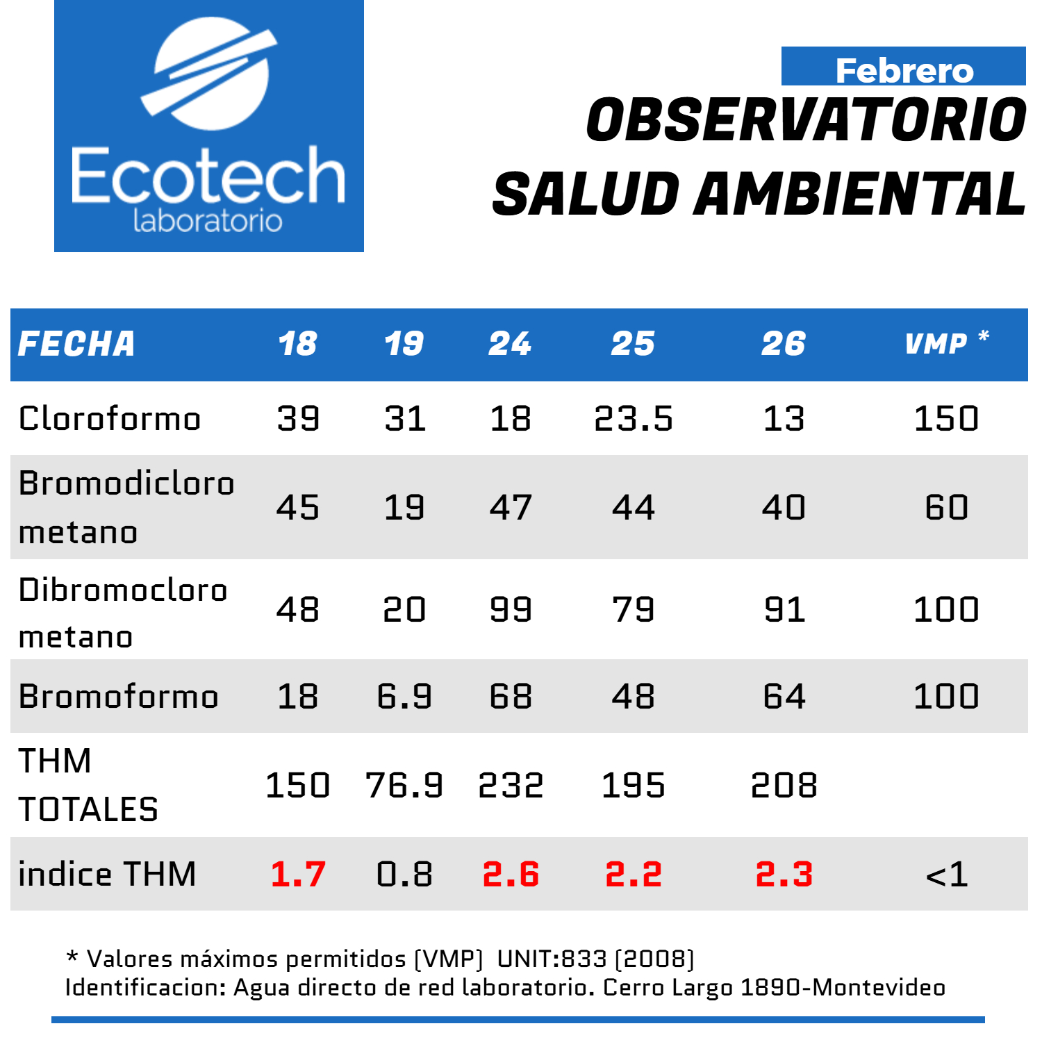 El Observatorio de Salud Ambiental Ecotech es una iniciativa del Laboratorio Ambiental Ecotech como parte de la Economía del Bien Común en Uruguay, enmarcada dentro en el concepto de Ciencia + Conciencia. Su objetivo es poner a disposición de toda la comunidad de forma gratuita, información actualizada sobre diferentes aspectos que hacen a la salud ambiental como concepto integrador de lo que impacta en la salud humana, como parte indisociable del ambiente y el medio ecológico. En estos momentos la calidad del agua que sale por las canillas de uruguayas y uruguayos en la zona metropolitana de Montevideo y Canelones, sea nuestro foco de atención.